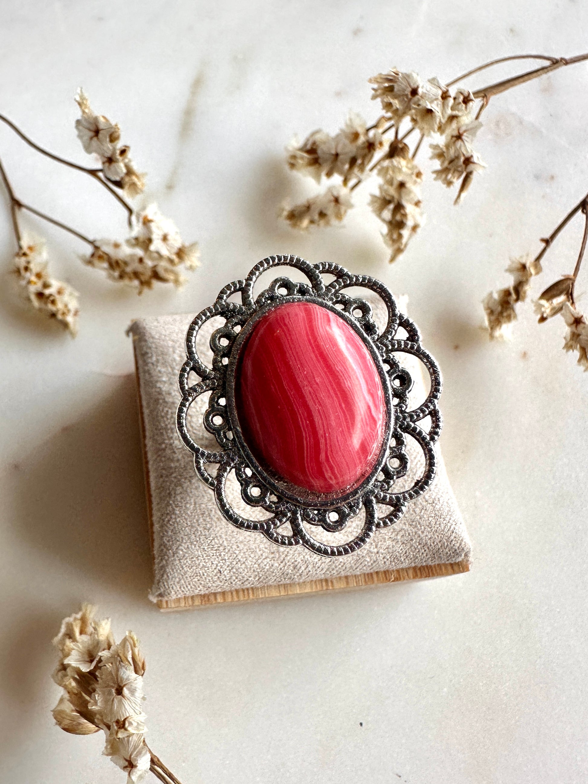 Sublimez votre style avec cette élégante bague ornée d’une pierre semi précieuse naturelle, montée sur un délicat anneau en métal argenté travaillé.